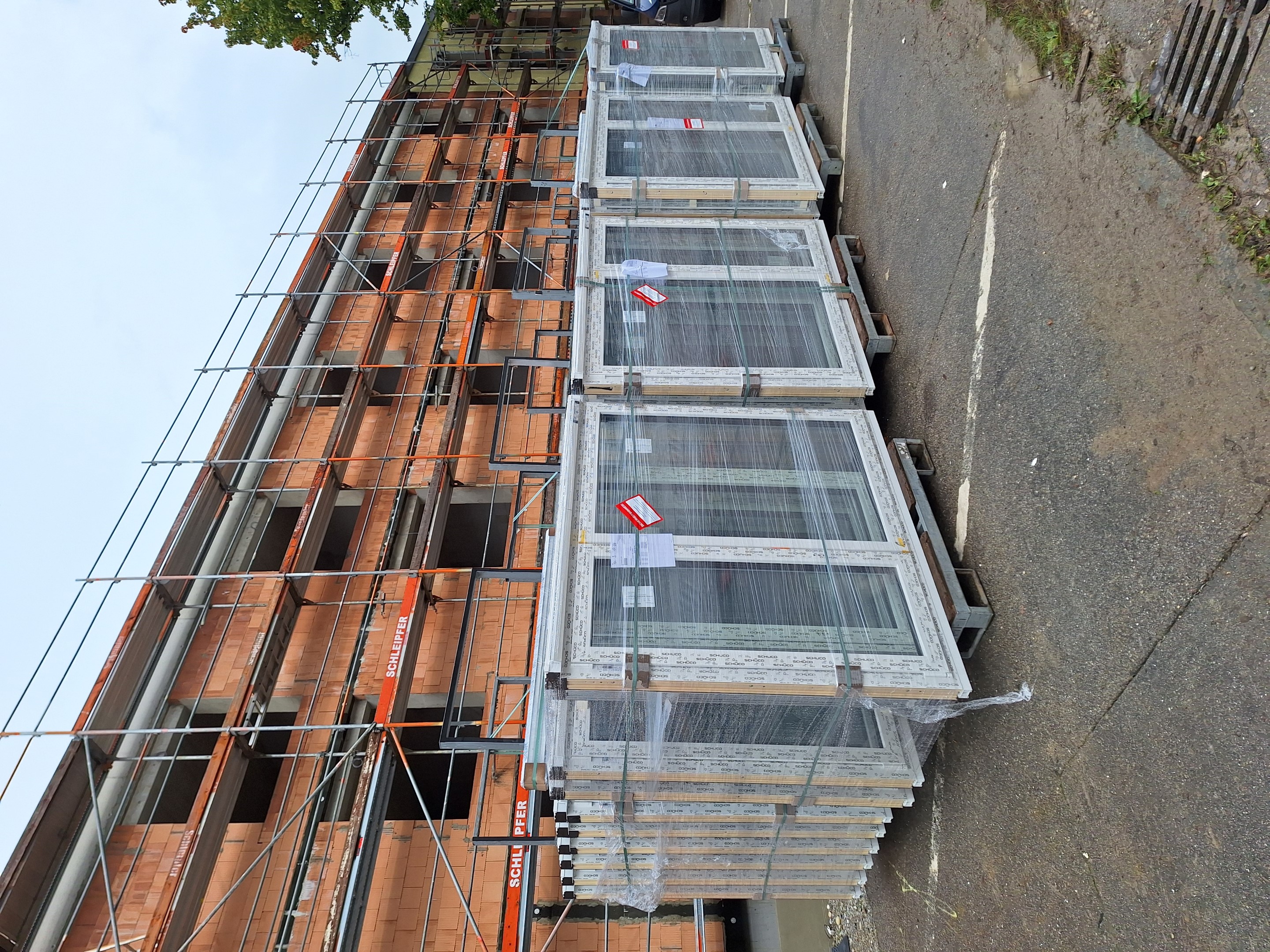 Gleichzeitig werden derweil die Fenster in allen Geschossen verbaut und die Jalousiekästen montiert. Sobald die Arbeiten abgeschlossen sind, erfolgt im Innenbereich der Ausbau der technischen Gewerke mit Ihren Rohinstallationsarbeiten.